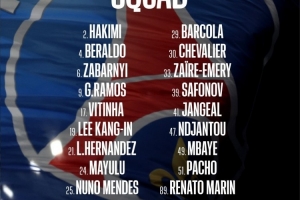巴黎客战里尔大名单:阿什拉夫、巴尔科拉在列,登贝莱等多人缺席